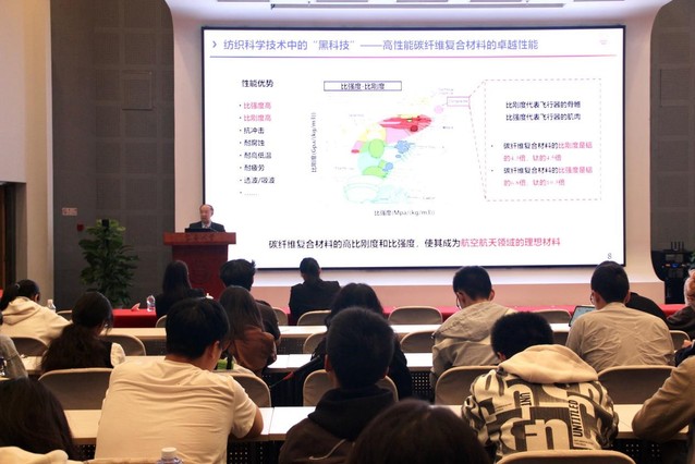 “现代纺织早已突破服装、家纺等传统民生消费领域,正向战略性新兴产业延伸。”孙以泽院士从纺织的内涵维度、科技维度和产业维度引导大家重塑对纺织的认知。他着重介绍了蕴藏在碳纤维复合材料中的“黑科技”,高性能纤维复合材料因其比强度高、比刚度高、耐高低温等卓越性能,广泛应用到航空航天、国防军工、重要民生等诸多前沿领域。他还讲述了带领团队成功研发高性能纤维三维编织、三维机织等装备,开发了复合材料大尺寸结构件的结构设计、性能仿真、精确成型、性能测试与评价技术体系,破解了高端纺织技术与装备的“卡脖子”难题,让同学们深切感受面向国家重大战略需求的“东华贡献”。课堂最后,孙以泽院士深入分析了纺织科技蕴藏的巨大产业机会和纺织科技未来的发展趋势,鼓励同学们立足学科前沿,夯实数学、物理、化学等基础学科功底,将个人所学与国家需求紧密结合起来。