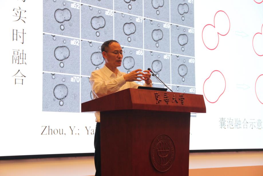 周永丰教授带领大家学习回顾了习近平总书记在2021年两院院士大会上关于加强基础研究的重要论述,从国家战略的高度指出,生命起源探索和发现是原创性基础研究的重要方向之一。他围绕“能否合成人工细胞”这一核心命题,系统阐述合成生命领域两大技术路径的发展脉络与研究进展。其中,“自上而下”路线实现从辛西娅1.0、辛西娅3.0到单染色体真核细胞的跨越,推动人类从“复制”生命走向“设计”生命;而“自下而上”路线则通过化学手段构建出能模拟细胞行为的人工仿生体系,让现场师生直观领略到化学与生物学科交叉融合的独特魅力。